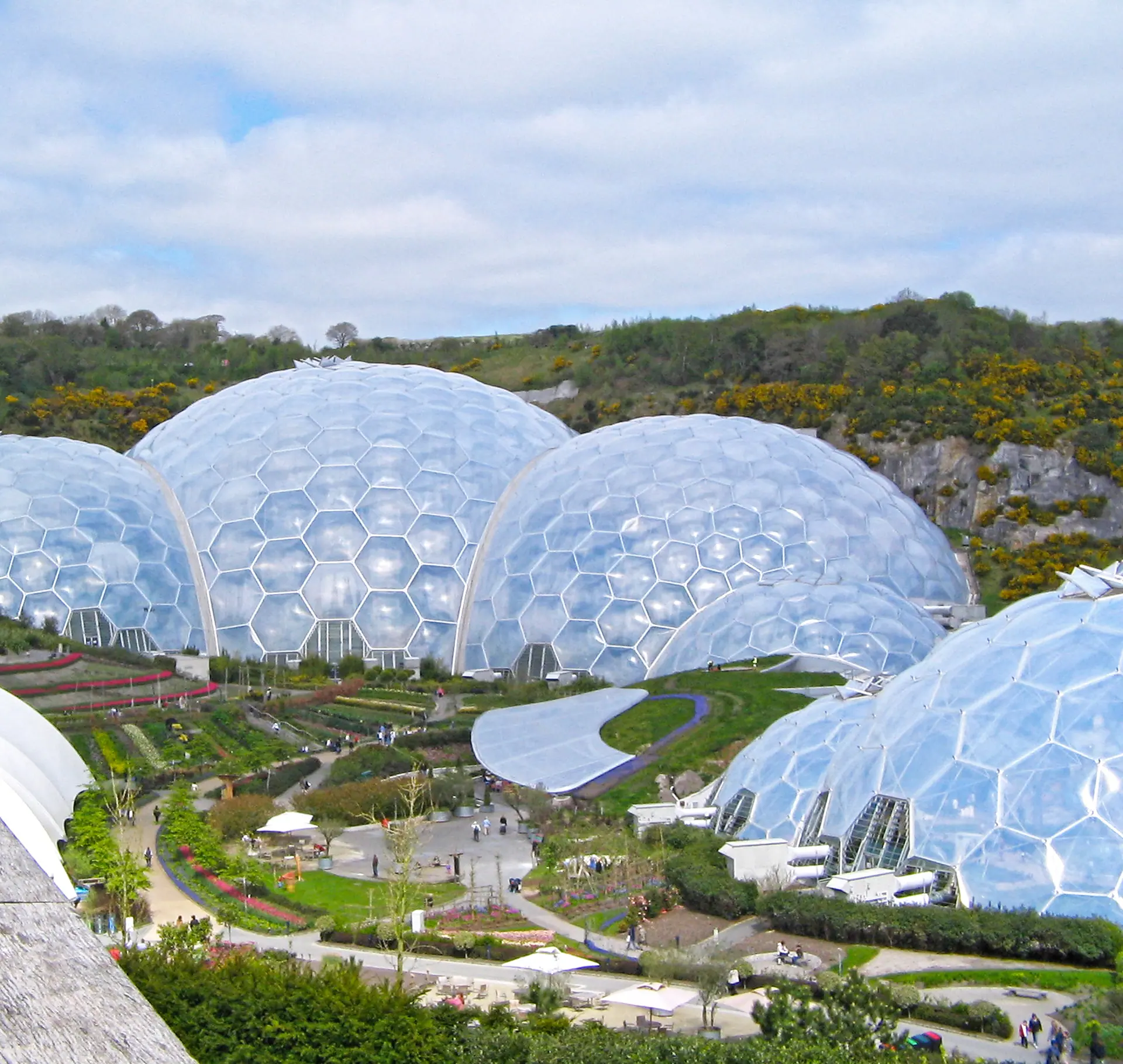 The Eden Project is a visitor attraction in Cornwall, England, situated in a reclaimed china clay pit 2 km from St Blazey and 5 km from St Austell. The complex features several large enclosures with adjoining domes that house thousands of plant species, each simulating a natural biome. The biomes consist of hexagonal and pentagonal inflated cells supported by geodesic tubular steel domes. The larger biome is the world's largest indoor rainforest, while the second simulates a Mediterranean environment. There is also an outdoor botanical garden with native plants and wildlife of Cornwall and the UK, alongside plants with significant historical backgrounds, such as those with prehistoric heritage.